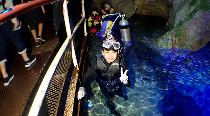 青く光る洞窟の比較的浅い水深の場所で、ダイビングの資格をお持ちでない方でも神秘的なダイビングをお楽しみいただけます。